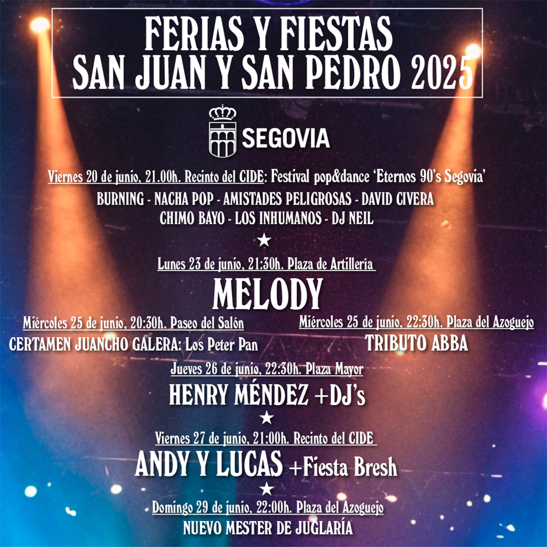 No faltará el certamen de música “Juancho Galera”, que se celebrará en el paseo del Salón el miércoles 25 de junio a las 21.00 horas y contará con la participación de los Peter Pan junto con los grupos segovianos ganadores del certamen. Una hora y media después, a las 22.30 horas, la plaza del Azoguejo acogerá el Tributo a ABBA, anunciado en exclusiva en CEDRUS https://cedrus.es/2025/04/29/la-bresh-essencial-abba-pikante-y-la-huella-en-las-fiestas-de-segovia/,el mítico grupo sueco que ha hecho bailar a muchas generaciones.