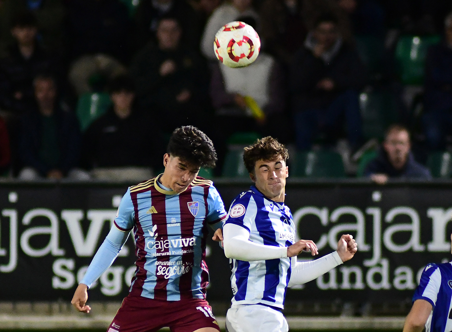 La primera mitad no dio tregua, tanto la Real Sociedad B como la Segoviana hicieron un despliegue físico tremendo, en un partido de contrastes en la clasificación, con la Segoviana intentando agarrarse a la salvación y la Real Sociedad B con las miras puestas en la fase de ascenso a la Liga Hypermotion. La salida eléctrica de los de Ramsés Gil sorprendió a al conjunto txuri-urdin, que sufrían en exceso la presión en bloque alto de los segovianos. Pese al alto ritmo hubo que esperar en demasía para que las hostilidades se desatasen en las áreas. Fue en el minuto 19 cuando llegó la primera ocasión, en una rápida jugada de Farrell que ponía a prueba a Fraga con un duro remate. El rechace lo cazó Gómez, pero el arquero blanquiazul se revolvió como un felino y bloco el balón en segunda instancia.