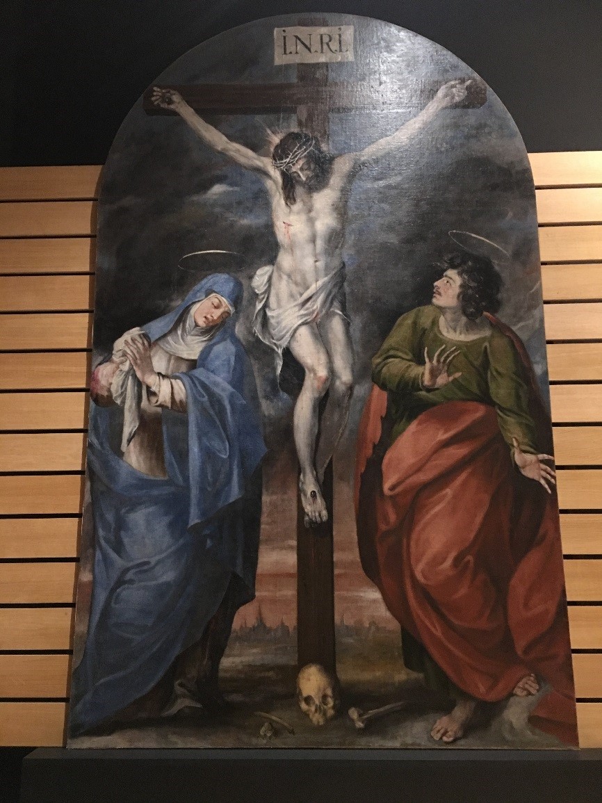 La escena sigue el esquema tradicional en el que Cristo se convierte en el eje de la composición. Clavado en la Cruz, está flanqueado a su derecha por la Virgen, que, afligida, baja la mirada amorosa hacia los pies del Hijo, mientras con sus manos aprieta el paño con el que se enjugará sus lágrimas, y a la izquierda por San Juan, que con gesto patético vuelve los ojos para mirar al rostro de Jesucristo, al que se le representa ya muerto y herido en el costado por la lanza de Longinos.