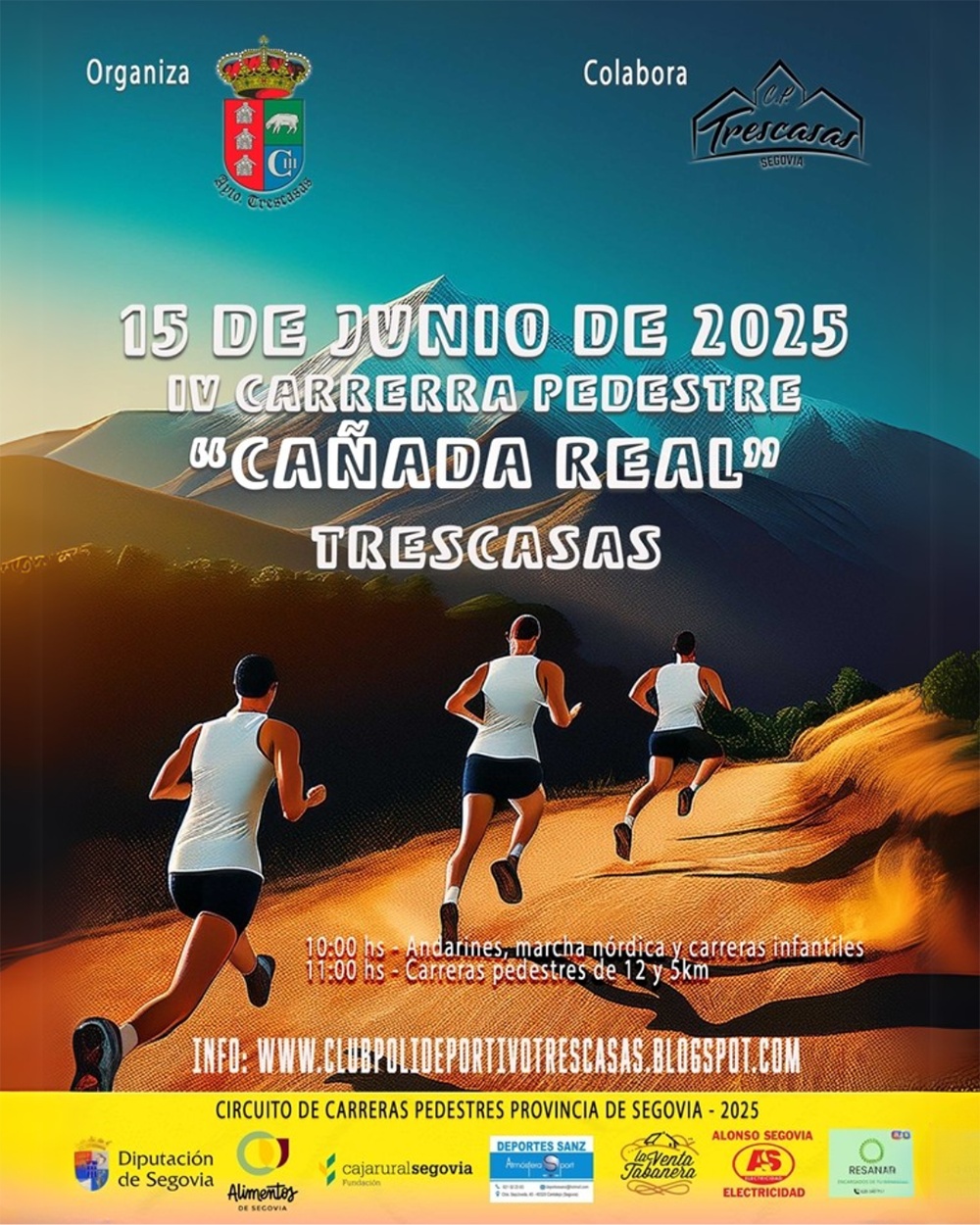 El Ayuntamiento de Trescasas en colaboración con el Club Polideportivo Trescasas, organiza el próximo domingo 15 de junio la IV Carrera Pedestre “Cañada Real”, una cita deportiva ya consolidada que aúna deporte, naturaleza y participación ciudadana en un entorno rural de gran valor paisajístico.