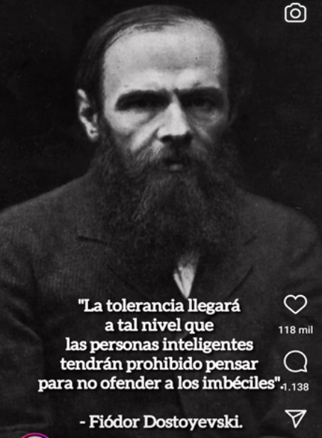 Aunque no existe evidencia de que Fiódor Dostoyevski haya escrito este aforismo —«La tolerancia llegará a tal nivel que a las personas inteligentes se les prohibirá pensar para no ofender a los imbéciles»—, la encontrará miles de veces repetida en las redes sociales, ya sea de forma literal o en versiones similares, y casi siempre atribuida al escritor ruso.