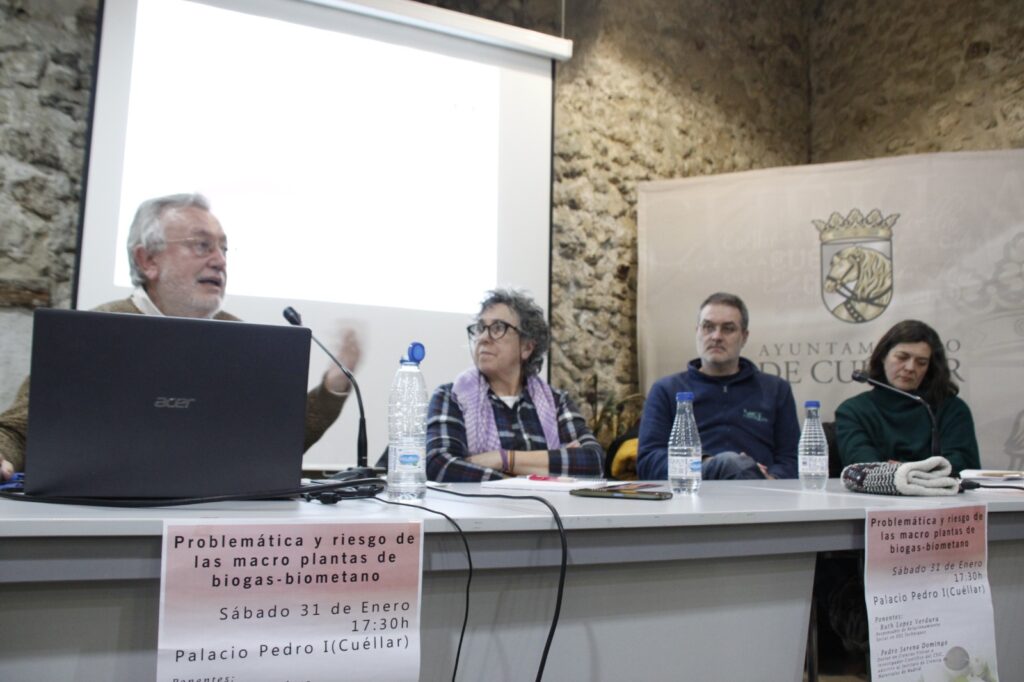La charla la abrió Monste Sanz, explicando las acciones realizadas por IU Cuéllar para intentar paralizar estos proyectos. La organización trabajó alegaciones para los cuatro proyectos publicados por la Junta de Castilla y León. Más de 400 personas firmaron las alegaciones redactadas por Izquierda Unida. Además, IU presentó en la Diputación una moción para pedir a la Junta de Castilla y León que paralice los proyectos de biogás en la provincia que no salió adelante por los votos en contra de PP y VOX.