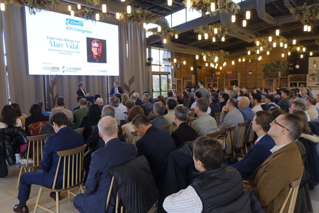 El Congreso EMFI, organizado por la Fundación Caja Rural de Segovia, ha arrancado con una charla/diálogo entre el analista económico y divulgador tecnológico Marc Vidal y José María Chaparro, director general adjunto de Cajaviva Caja Rural, en la que se han abordado los profundos cambios que está provocando la denominada quinta revolución tecnológica y el impacto directo de la inteligencia artificial en el empleo, la economía y la sociedad.